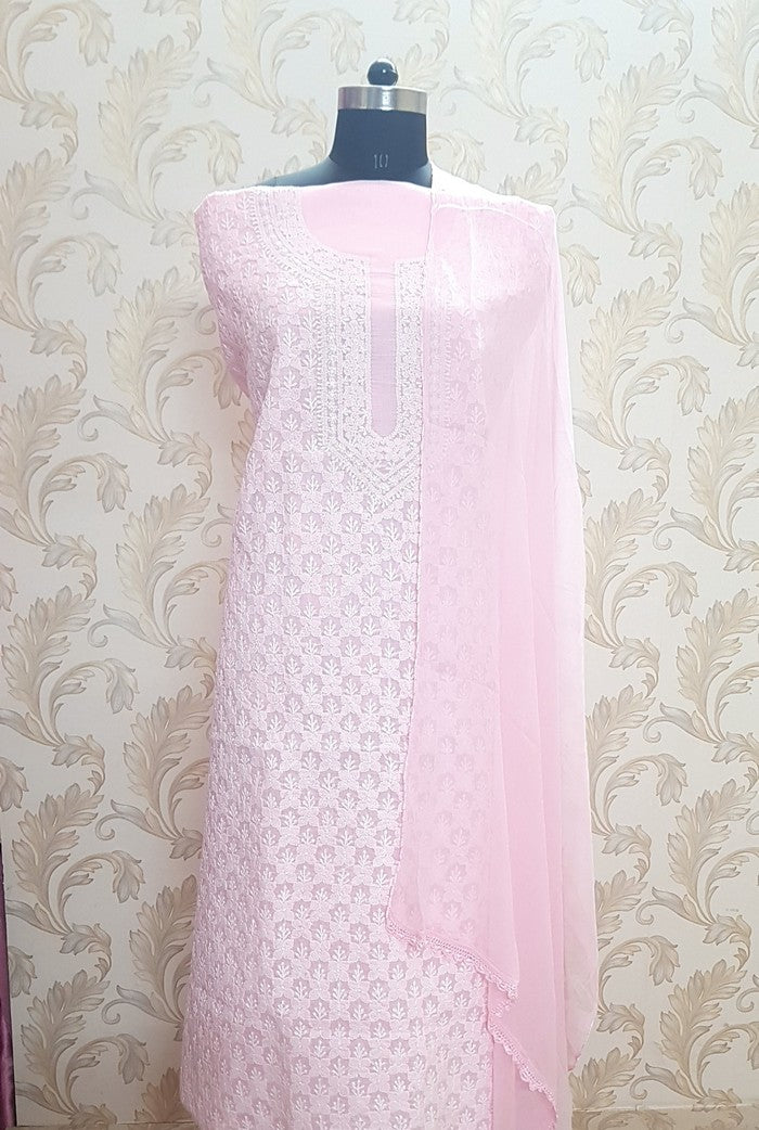 For all the natural fabric lovers, we bring to you an exquisite product in pure cotton fabric. These full Chikankari Cotton Suits are adorned with intricate hand embroidered Chikankari. Sleeves are beautifully patterned. Back and bottom comes with motifs. Dupatta in pure chiffon is shaded n comes with a crochet border.