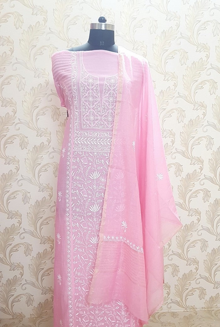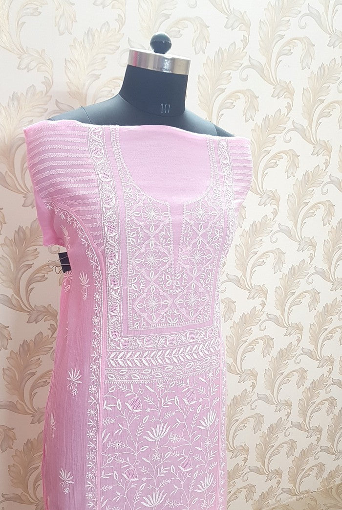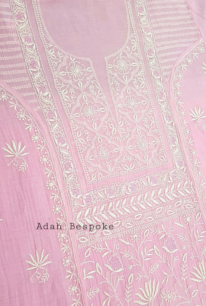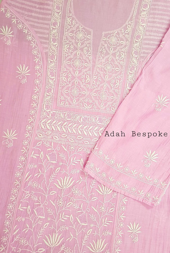 A finely handcrafted lakhnawi chikankari piece is ever so pleasing to the eyes.. this beautiful pure mul chanderi kurta dupatta set looks ethereal and irresistible. This gorgeous pastel hue embellished with jaali work will surely amp up your ethnic look. The hand made applique details just add the right definition to the ensemble.
