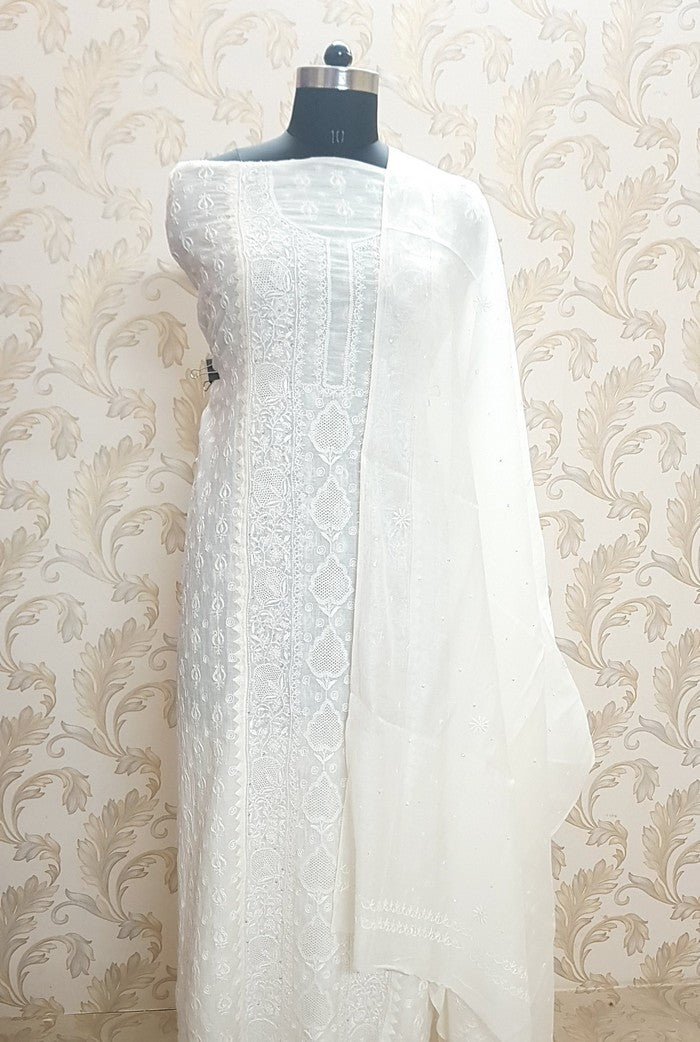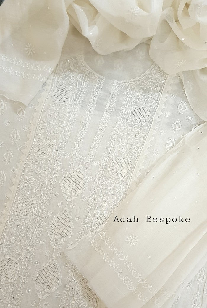 A finely handcrafted lakhnawi chikankari piece is ever so pleasing to the eyes.. this beautiful pure mul chanderi silk chikankari kurta dupatta set looks ethereal and irresistible. This gorgeous pastel hue embellished with cutdana and sequins work will surely amp up your ethnic look. The hand made applique details just add the right definition to the ensemble.
